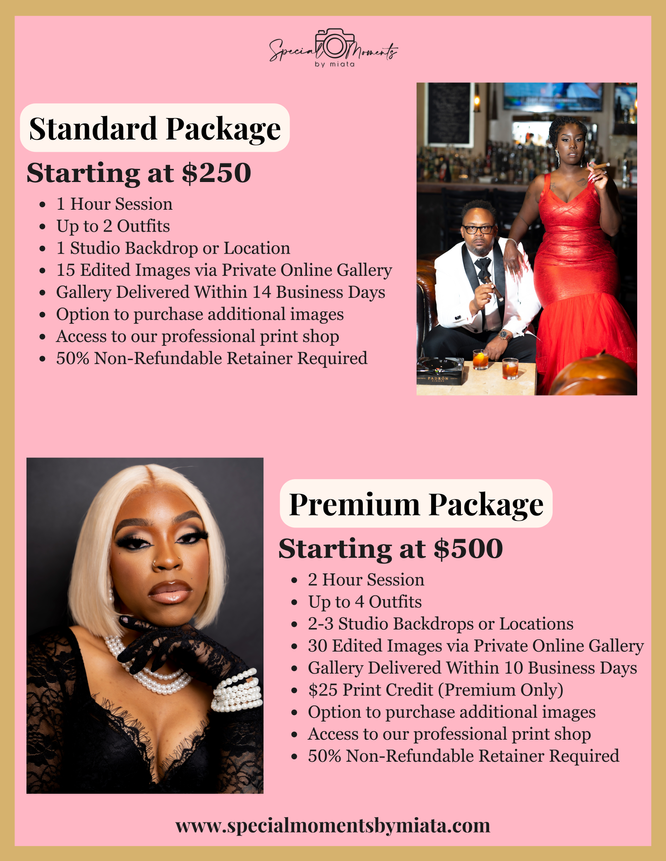 Elevate your package with personalized options designed to fit your vision. From session upgrades and wedding enhancements to photo booth add-ons, you can tailor every detail of your experience. Explore additional hours, premium backdrops, themed props, and keepsake prints — plus a full shop of albums, flash drives, and custom portraits. Transparent fees and flexible upgrades ensure you get exactly what you need for memories that last.